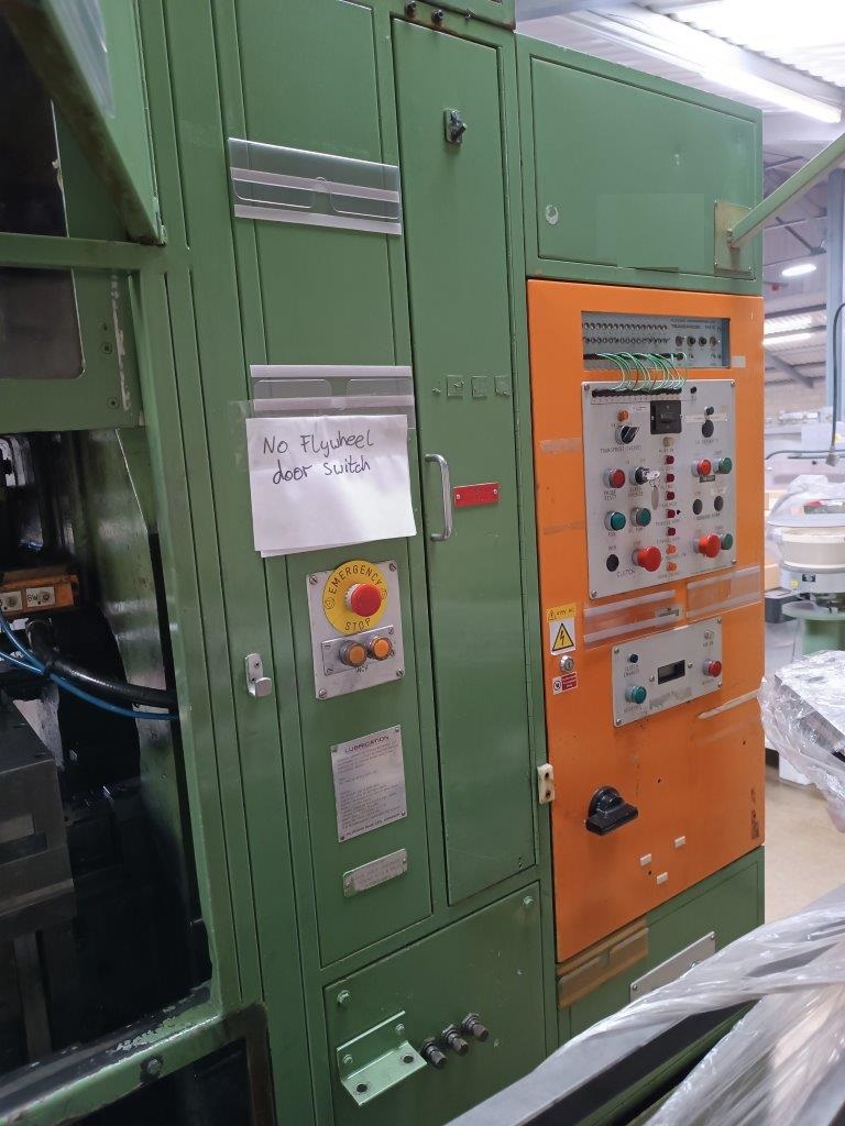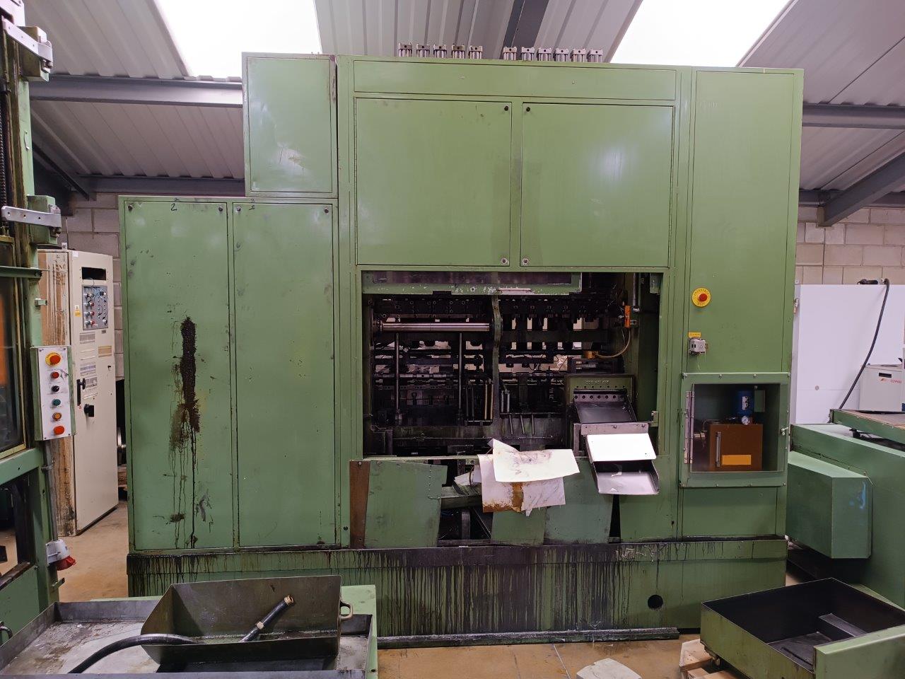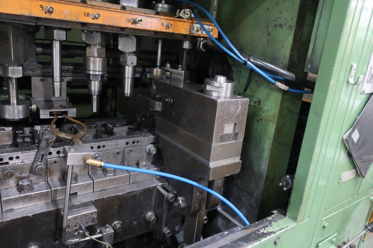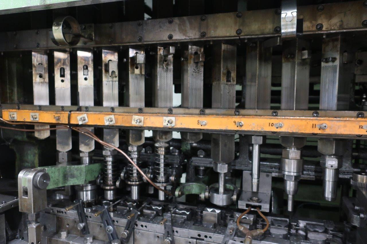 | Maquina actualmente almacenada – funcionaba correctamente en producción antes de desconectar. Levas de carrera de elevación alta de 159 mm – altura máxima de la carcasa de 76 mm 13 estaciones, 12 cilindros + 1 esclavo Regulación de altura por cuña con portaherramientas de rosca macho estándar Juego completo de bloques de matriz Conjunto de eje lateral con embrague de seguridad Cilindros de equilibrado neumáticos Variador de velocidad mecánica Unidad de embrague/freno Orlinghaus Protectores insonorizados Panel de control eléctrico de Platarg Unidad Transprobe Mark 6 de Platarg |