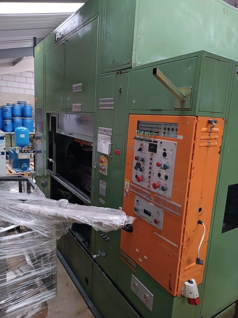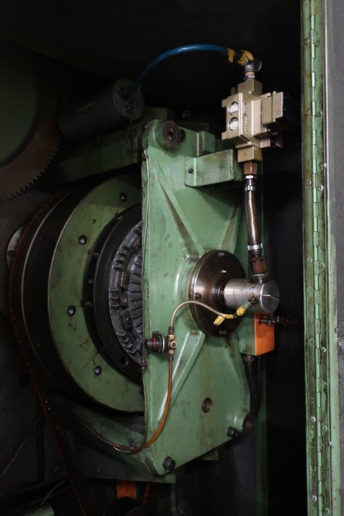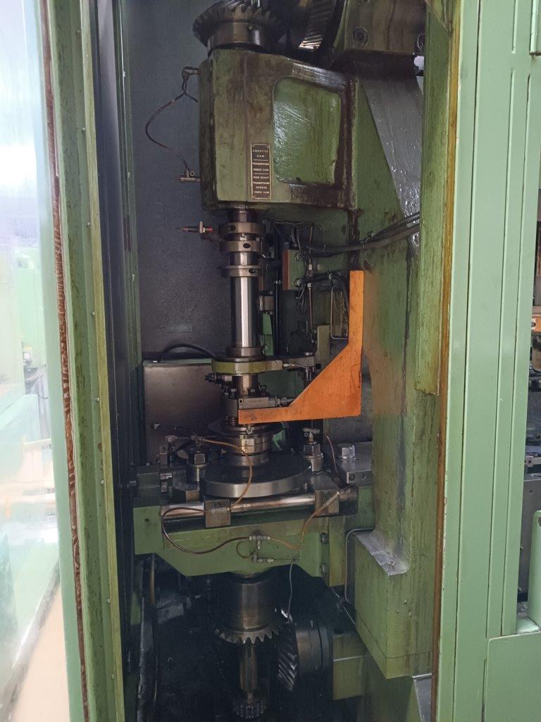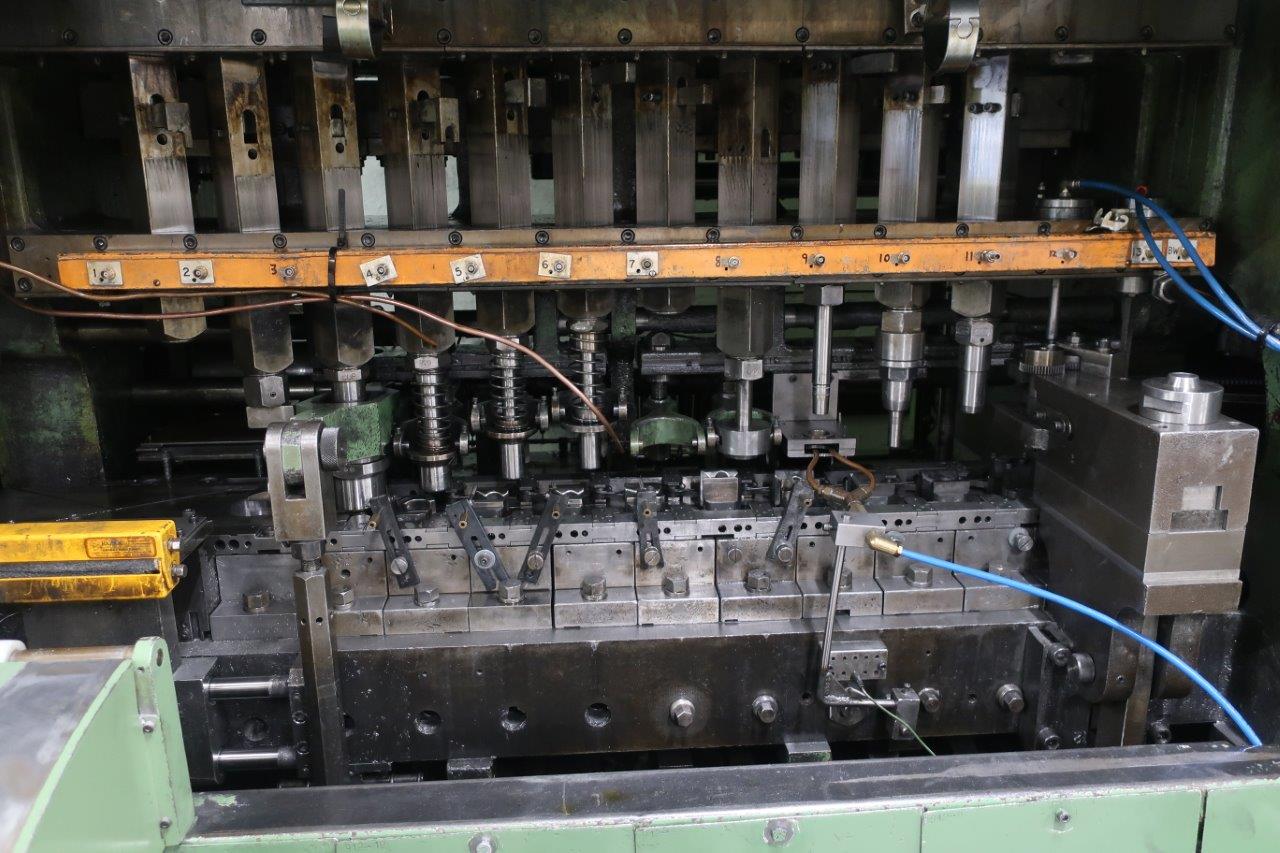 | Maquina actualmente almacenada – funcionaba correctamente en producción antes de desconectar. Levas de carrera de elevación alta de 159 mm – altura máxima de la carcasa de 76 mm 13 estaciones, 12 cilindros + 1 esclavo Regulación de altura por cuña con portaherramientas de rosca macho estándar Juego completo de bloques de matriz Conjunto de eje lateral con embrague de seguridad Cilindros de equilibrado neumáticos Variador de velocidad mecánica Unidad de embrague/freno Orlinghaus Protectores insonorizados Panel de control eléctrico de Platarg Unidad Transprobe Mark 6 de Platarg |